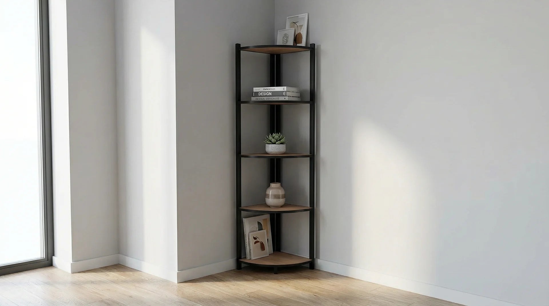 El esquinero metálico armable es ideal para aprovechar espacios con estilo y funcionalidad. Cuenta con cinco bandejas de melamina de 15mm en color jerez, protegidas con tapacanto plástico negro, que ofrecen resistencia y fácil limpieza. Su estructura de acero esmaltado al horno, en elegante color negro, asegura durabilidad y estabilidad. Fácil de armar con herramientas y herrajes incluidos, su diseño compacto de 36.5 x 36.5 cm y 150 cm de altura se adapta a diversos ambientes sin ocupar mucho espacio. Un mueble práctico y resistente que optimiza tu organización con un toque moderno.