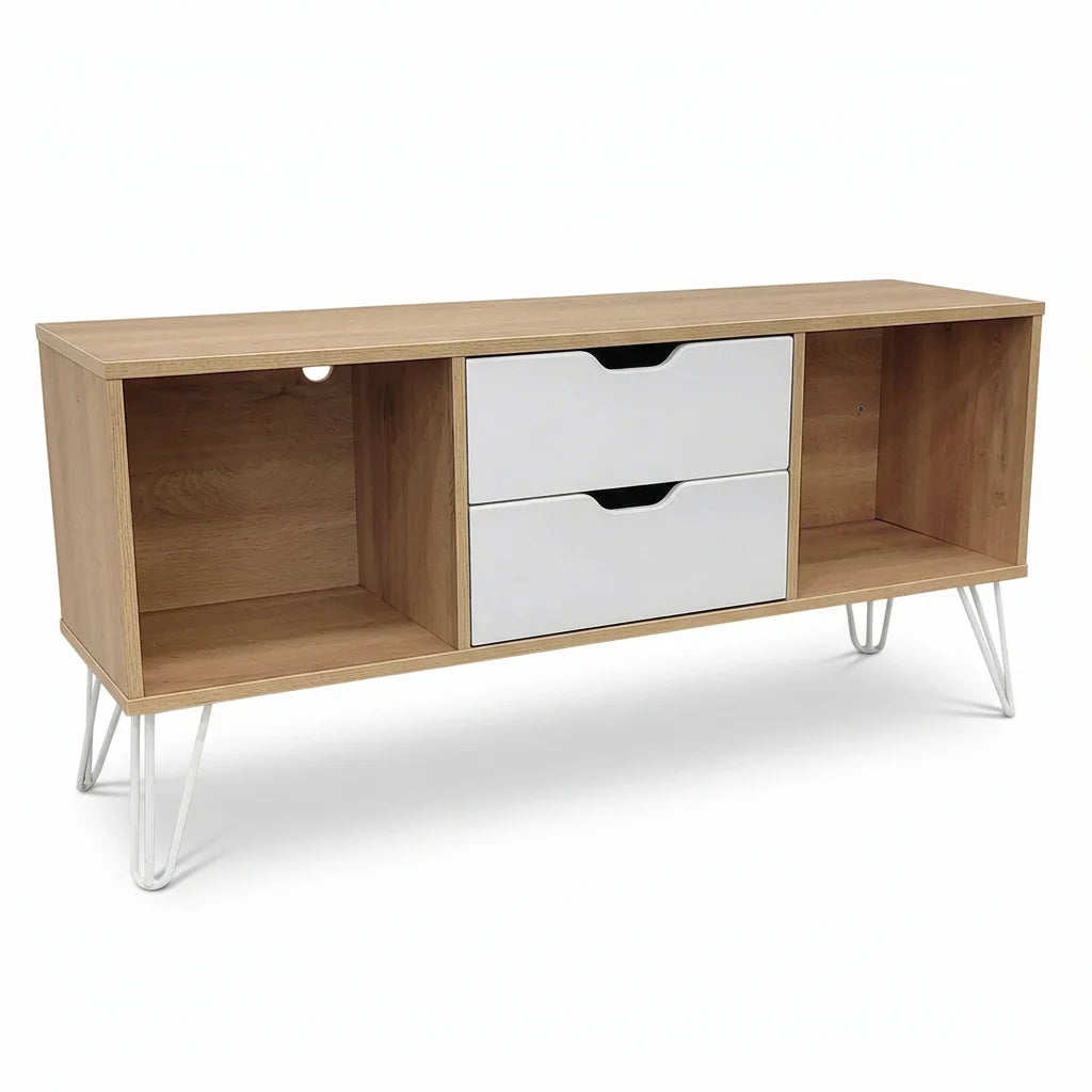Este rack para TV de estilo vintage en acabado Jerez combina funcionalidad y diseño elegante para complementar cualquier espacio. Su estructura, fabricada en melamina de alta resistencia de 18 mm en la cubierta y base, y en 15 mm en el cuerpo, garantiza durabilidad y estabilidad. El frente en MDF lacado blanco aporta un toque moderno y luminoso, mientras que los cajones con correderas telescópicas ofrecen apertura suave y almacenamiento eficiente. Sus patas metálicas esmaltadas al horno no solo aseguran firmeza, sino que refuerzan su estética industrial. Con dimensiones de 120 cm de ancho, 34 cm de profundidad y 57 cm de alto, es ideal para optimizar tu sala sin ocupar mucho espacio. Además, se entrega desarmado y embalado en cajas, facilitando su transporte y montaje. Su peso de 21,8 kg refleja materiales robustos que garantizan larga
