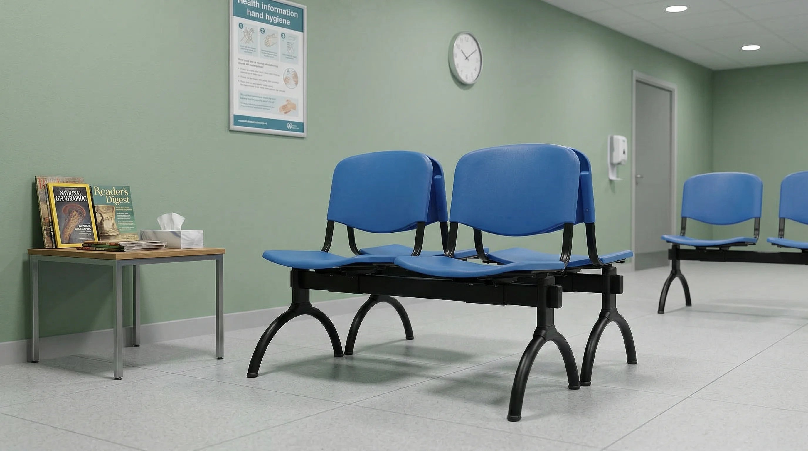 Banqueta de asientos ISO con estructura de acero color negro, respaldos y asientos en polipropileno, disponible en una amplia gama de colores (Consultar disponibilidad).